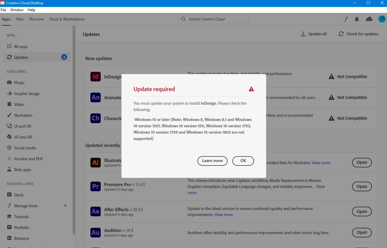 Creative Cloud stuck in compatibility mode, can't update apps