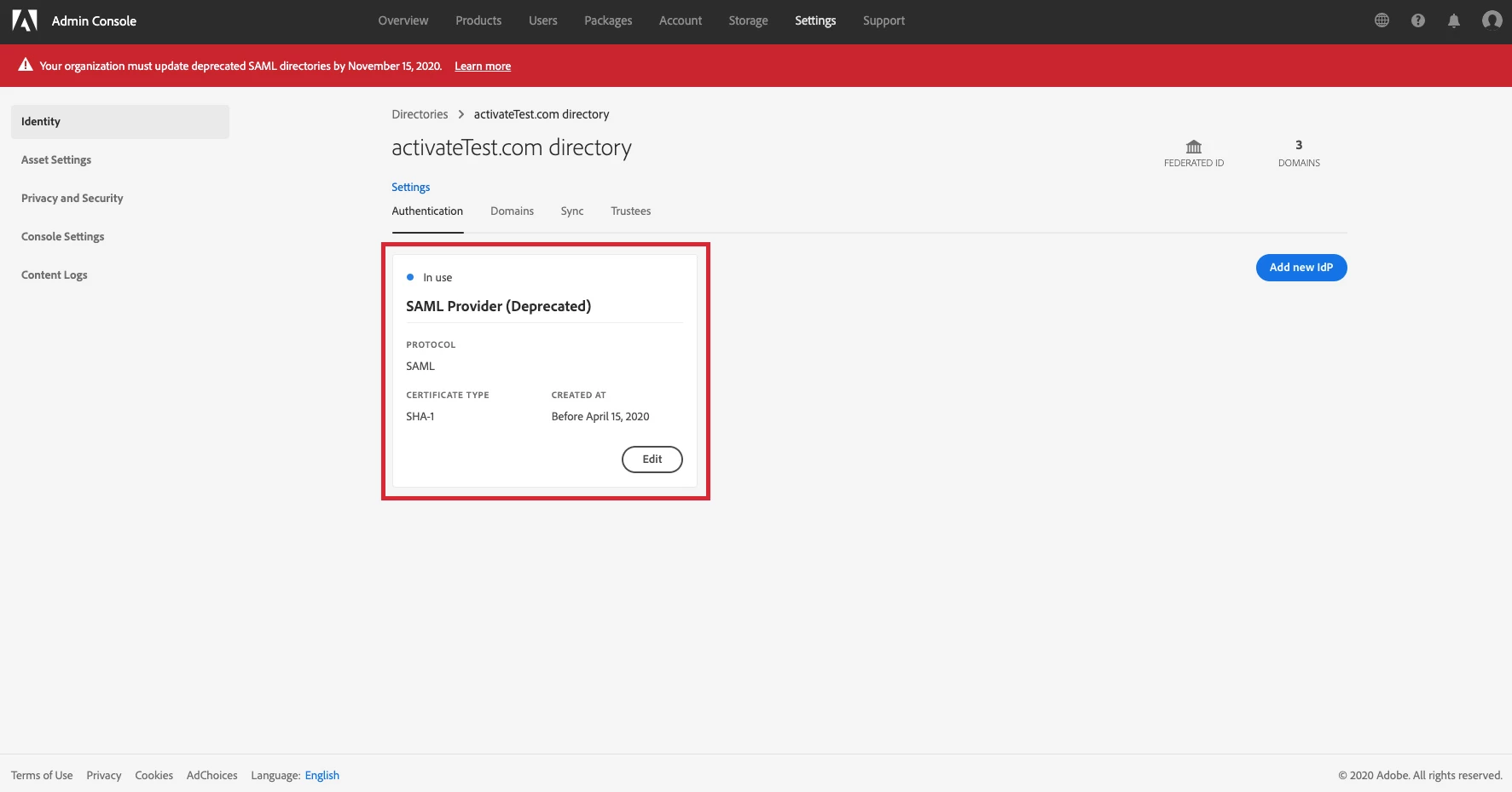 Migration of federated directories to SHA-256 protocol aligns with industry standard, providing a more secure and direct integration with Adobe of your directory's authentication profiles. A self-service feature is available in the Adobe Admin Console that allows your organization to seamlessly migrate from a SHA-1 to a SHA-256 configuration requiring no down time and the ability to test prior to integration. With this solution, you can leverage the same directory as well as integrate directly with your identity provider, such as Azure, Google or any SAML 2.0 provider. Within the Admin Console, any directories with a SHA-1 or SHA-256 Pilot certificate are now indicated with an icon and banner notification to alert your administrators to which directories require an update.