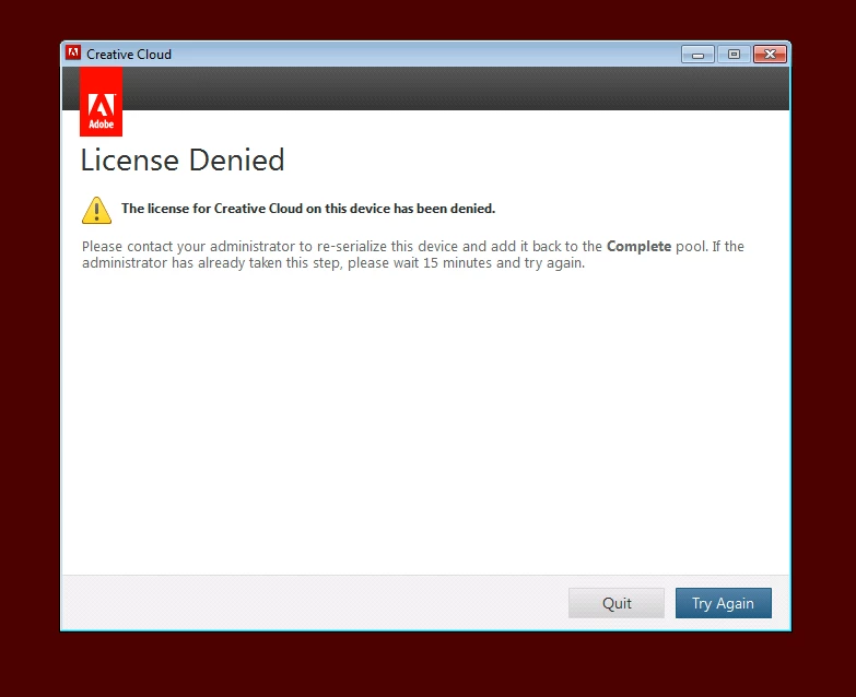 Please contact your administrator to re-serialize this device and add it back to the Complete pool. If the administrator has already taken this step, please wait 15 minutes and try again.