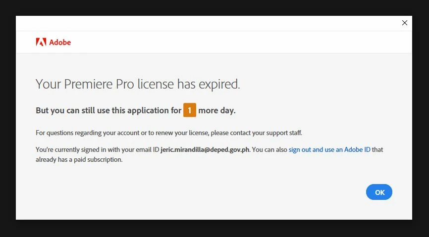 I had to change the date and time settings of my laptop and then when I tried opening any of my Adobe apps, this warning keeps showing up. It now shows that I only have 1 day to use my applications, but my subscription hasn't expired yet.