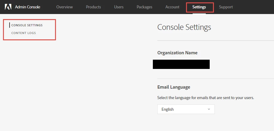 After logging in with the admin account to the Creative Cloud admin console, i navigate to the 'Settings' tab.