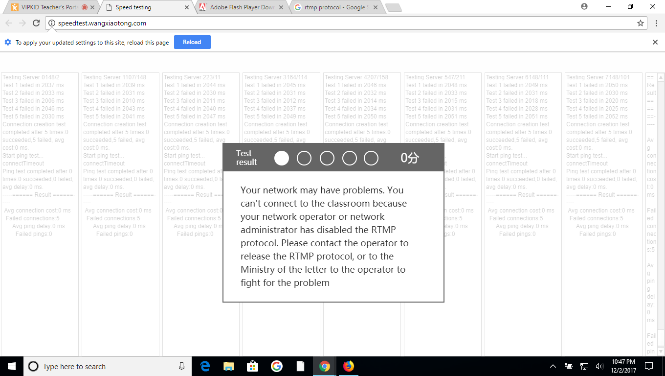 Anyway, the RTMP connection issues sounds like a firewall thing, and it may not be within your control. You're able to connect to the website via HTTPS over port 443, but the RTMP connection (which is generally 1935, but can be arbitrarily defined) isn't getting to the remote server, and it isn't falling back to tunneling over port 443. This could happen for a number of reasons, but most likely, some kind of service outage at the content provider that will probably resolve on it's own when they discover and fix it, a firewall configuration that blocks this at your computer or the network perimeter (more likely), or an issue in between you and the remote host that causes the traffic to get lost.