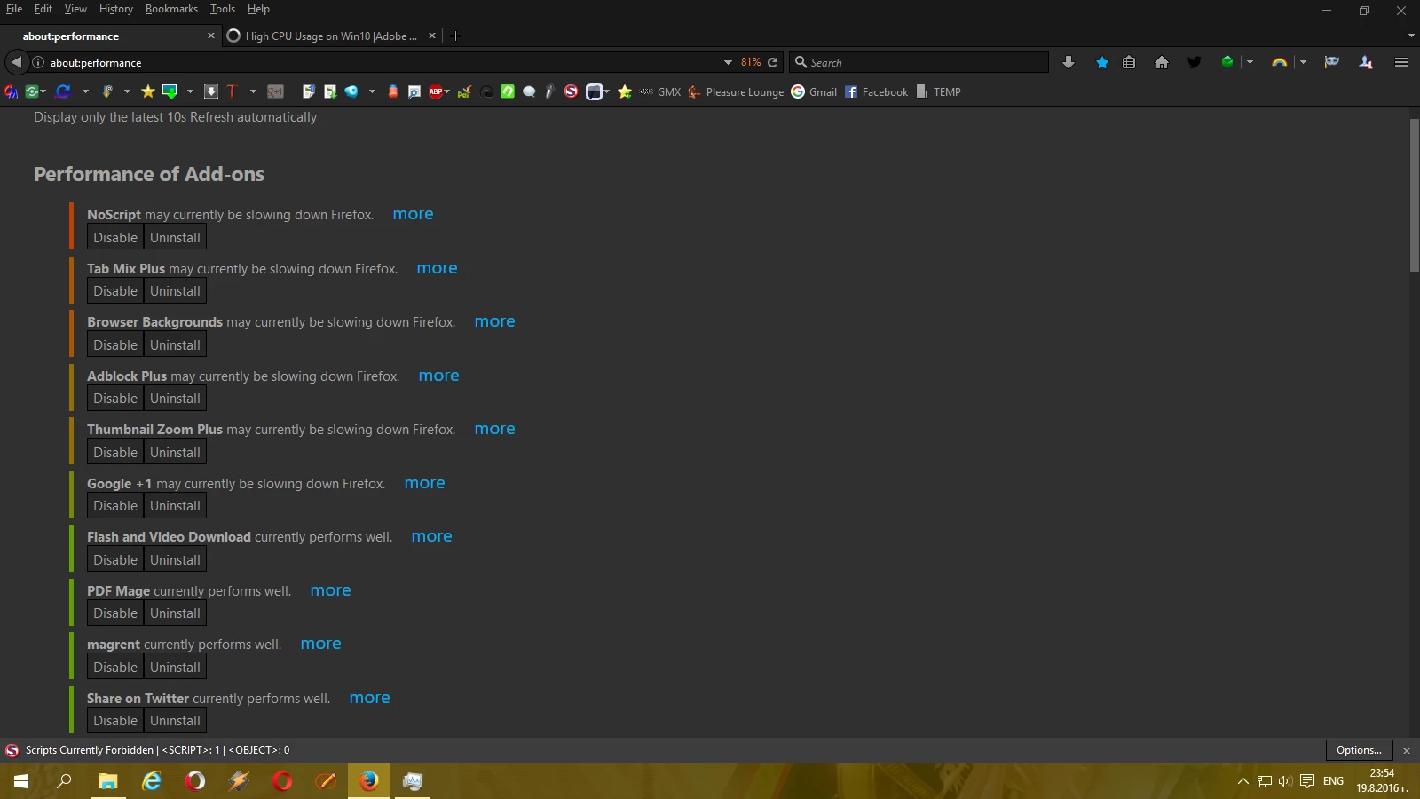 I installed FFx64 and removed x86 one. Profile was kept but unfortunately the CPU issue still persists. You helped me much with telling me about about:performance, I didn't know it. Here is a screenshot of what happens while I opened this page here. As if it is true my suspicion that AdBlock+ and NoScript are a part of the problem?