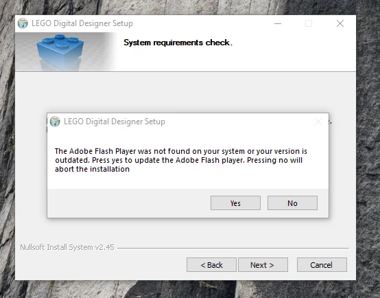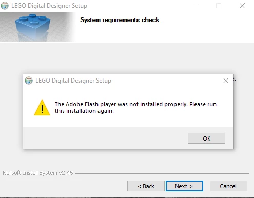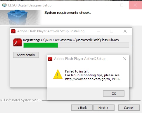 I am trying to install a LEGO program on my PC. Every time the installation starts it says that Adobe Flash is either not installed or is out of date and it needs to install it. Then it fails to install.