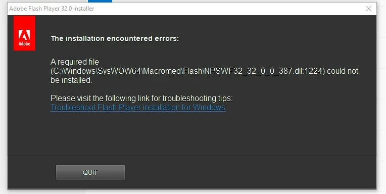 I am unable to install flash 32 in my windows 10 properly because one of the file is prompted that it could not be installed.what to do next