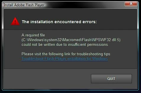First is when I go to install it I get a screen saying that the file "C:\Windows\System\32\Macroomed\Flash\NPSWF32.dll:5" could not be written due to insufficient permissions. I have no idea how to fix this or change it.