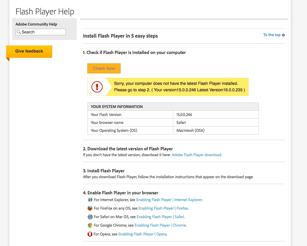 Safari displays that I have Adobe Flash Player version 15.0.0.246 installed.  But when I use Adobe Help it states that my Flash Player is out of data, download current version: 15.0.0.235.