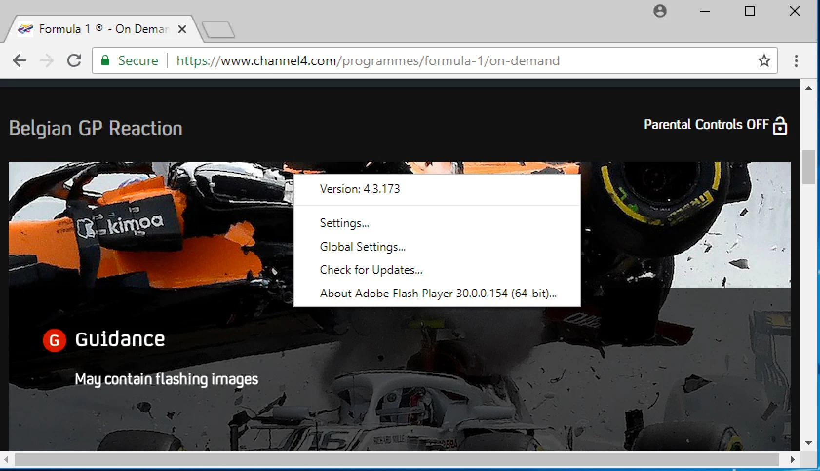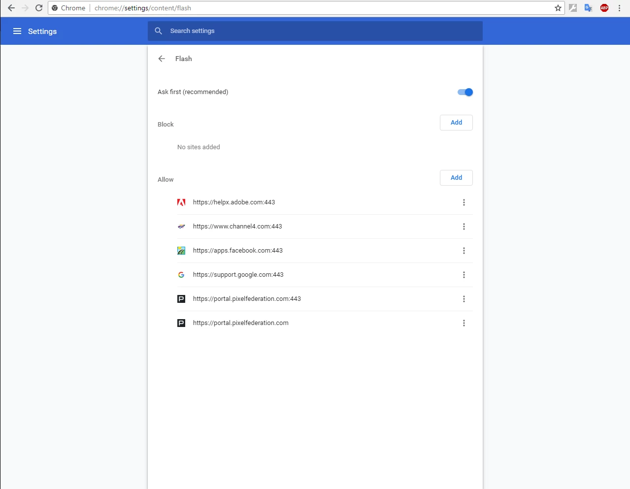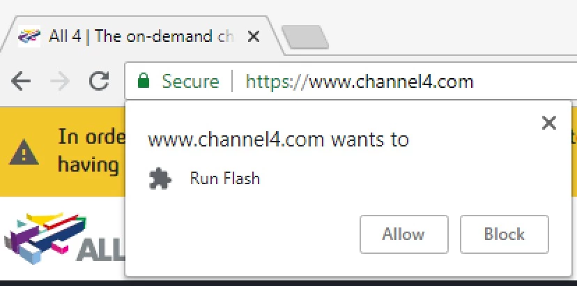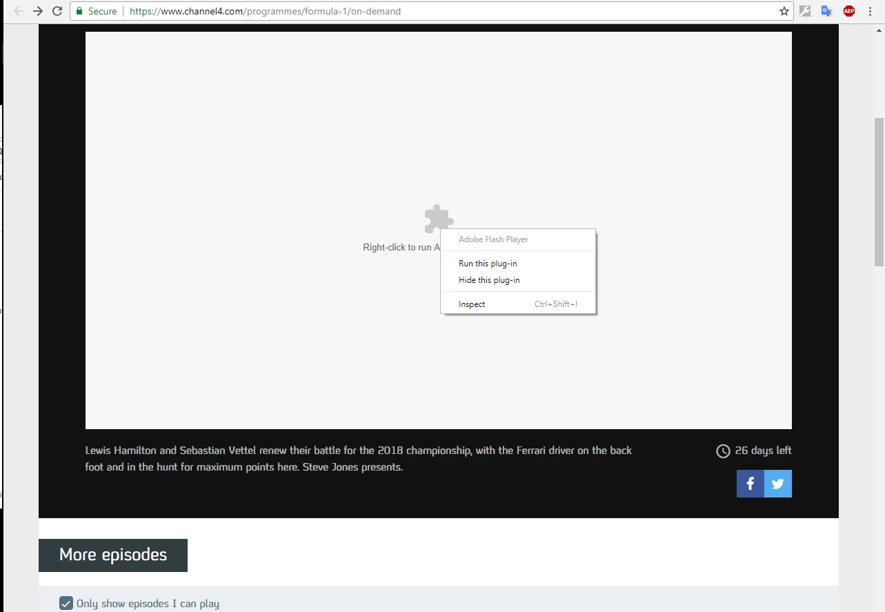 When trying to access three websites part of the window does not render, a white screen is displayed with the text "Right click to run Adobe Flash Player" under a logo like a piece from a jigsaw