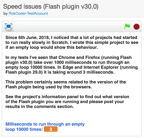 We are getting reports from users throughout the Scratch (scratch.mit.edu) community of performance issues related to Flash 30. Upon a deeper investigation it seems as if the main event loop is running much more slowly even in simple tests, this may have something to do with hardware (GPU) acceleration, but more investigation is needed. Results of a single benchmark for Chrome on MacOS are included below, but we are seeing the impacts of these across all 200+ million projects shared in the Scratch online community. We have also been able to repro this on Firefox and Safari on MacOS. We will be testing on Windows shortly and will post results here once complete.