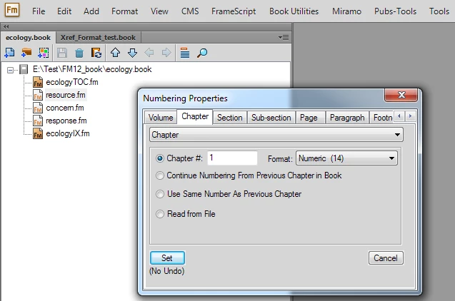 In my example above, using <chapnum>, the Installation chapter displays as Chapter 4, corresponding to the 4th file in the book! I want it to say "Chapter 2" corresponding to the second chapter in the book! I've selected "continue numbering" everywhere I can find it, from the Format > Document level, and by right-clicking the file from the book file list. I've updated the toc each time.