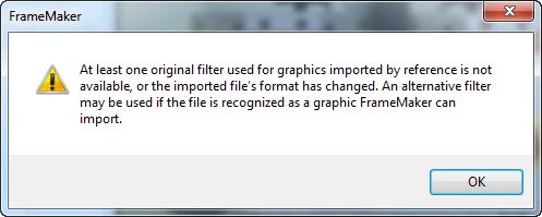 At least one original filter used for graphics imported by reference is not available, or the imported file's format has changed. An alternative filter may be used if the file is recognized as a grahpic FrameMaker can import.