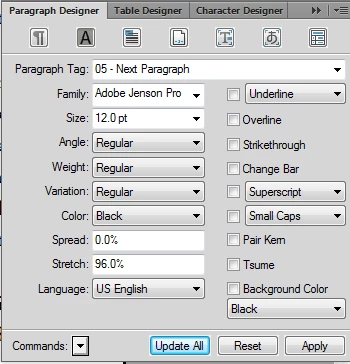I am using FrameMaker 12.0 with Adobe Jenson family of fonts. I am moving a high fantasy novel from Word over to FrameMaker. Currently, the typesetting in word seems tighter than in FM. Please look at these two images: