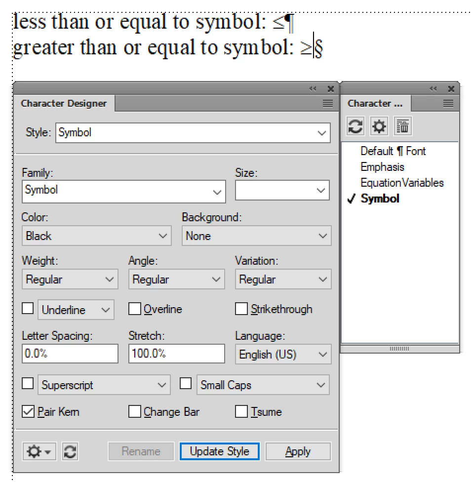 In FrameMaker 12, how do you type greater than/less than/greater than or equal to/less than or equal to? For example, how would you type "less than or equal to 3" with symbols instead of words? Right now, my workaround is to create a new equation, pick what I want from the Relations group, and then drag the border of the equation box in until it covers the question mark on the left side of the equation.