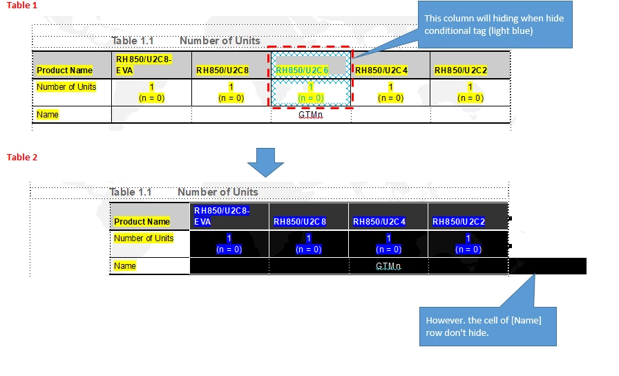 In this case, I want to change table 1 into table 2. However. the cell of [Name] row don't hide.