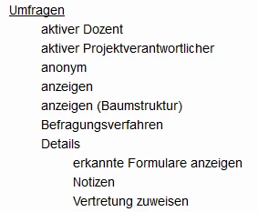Example: In this case, my search for "aktiver Dozent" will show no results because it's a second level subentry, only "Umfrage" (the first level) is browsable.