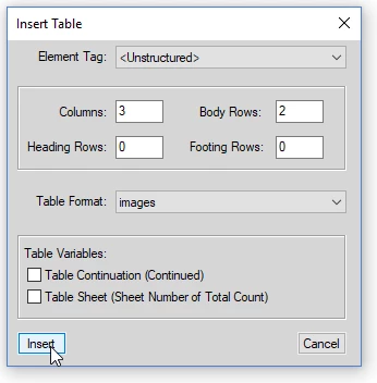 3. Set the new table to have three columns and two body rows. No heading or footing rows and the Table Format = images*