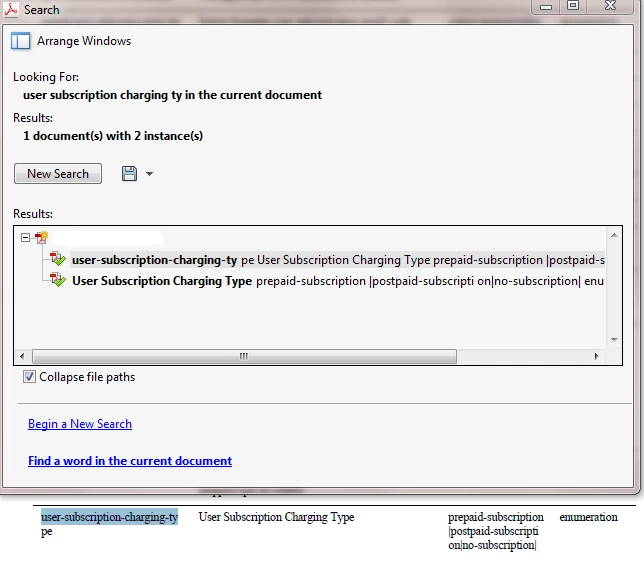 The table text is set to not hyphenate because most of the command parameters contain hyphens, and I don't want to confuse the reader. However, I can only find the phrase when I search for the part of the phase that is on the first line.  In the attached example, I search for "user subscription charging ty" and find both instances.  If I search for "user subscription charging type", I only find the one instance - the phrase in the second column.  Acrobat seems to add a space when a word breaks onto a second line.