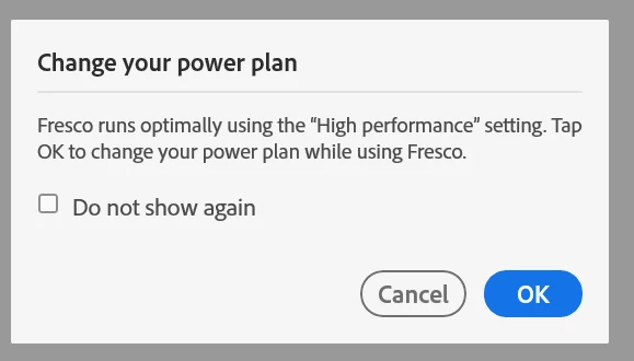Fresco runs optimally using the "high performance" setting. Tap OK to change your power plan while using Fresco.