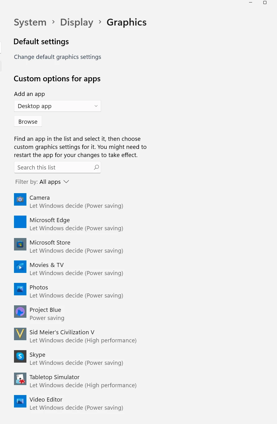 And here are the app specific power settings - where I imagine I would want the override.