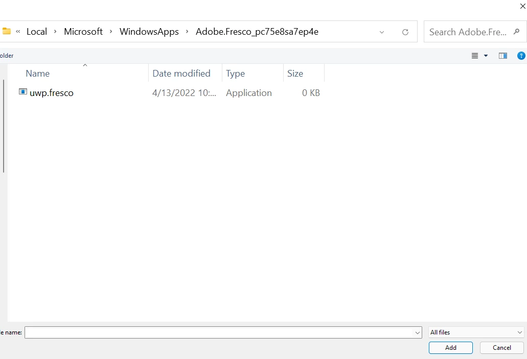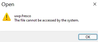 Howevere, when I try to add Fresco via the path  mentioned in other posts C:\Users\COMPUTERNAME\AppData\Local\Microsoft\WindowsApps ) it gives the "file cannot be accesssed by system" error.