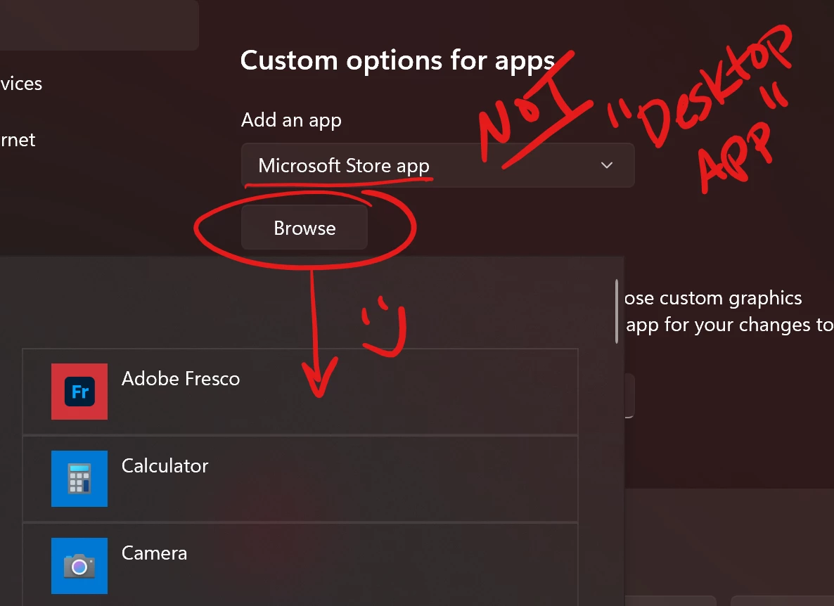 Where it says "Desktop App" (as seen in OP's screenshot) there is another option if you use the drop-down- "Microsoft Store app". This seems to be code for all UWP apps coz I chose it, clicked Browse, and Fresco was right there. Select it and change its settings however you like. ✌️✨