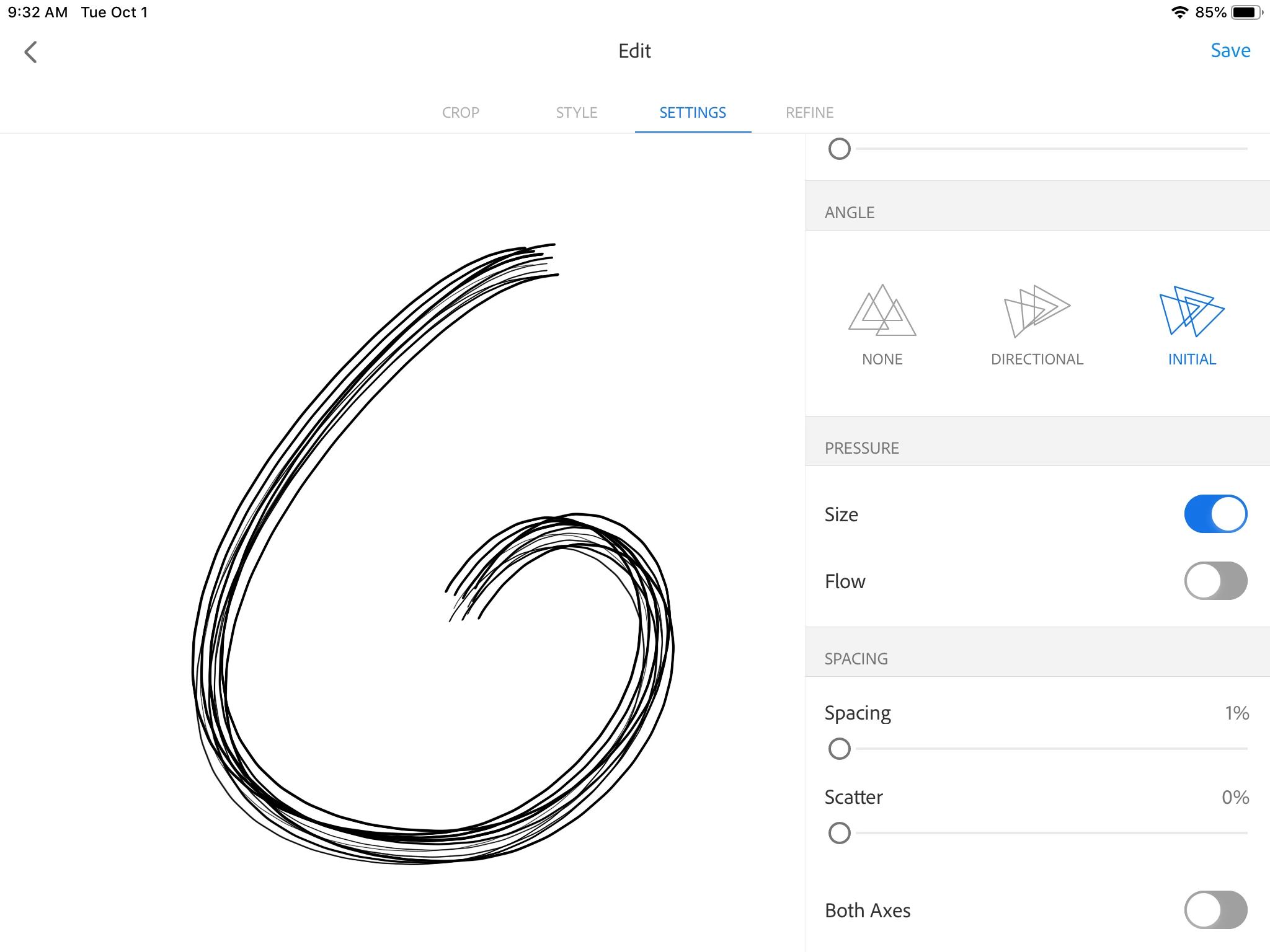 6. Turn of the Size under the pressure setting, for drawing with an Apple pencil. Take the spacing to 1%.