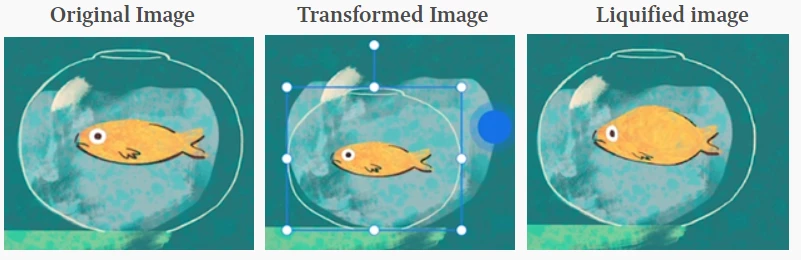 The above set of images clearly depicts that while using the default transform tool the complete image is getting impacted because we control it via corners. However, while using Liquify tool, we have just used the Bloat effect on the stomach of the fish without impacting the remaining image. Similarly, liquify tool provides us with a lot of other effects which help us to enhance our artwork.