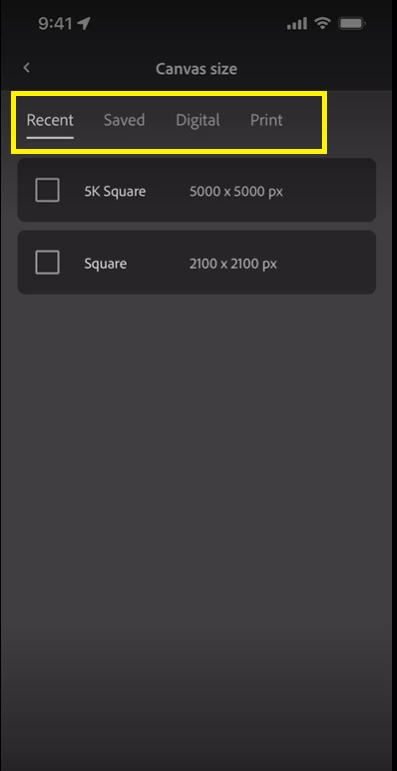 5. Use the desired preset. (Recent/Saved/Digital/Print)