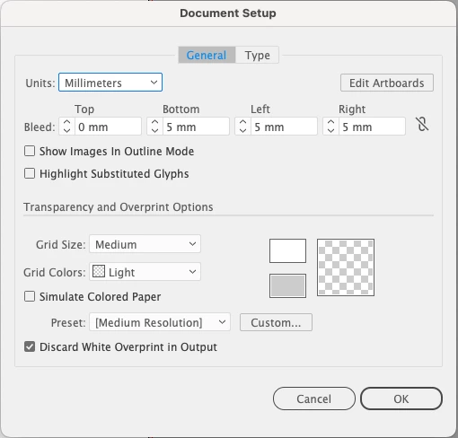 I'm creating a document as above. The document can be any size. Illustrator is creating a document with 0mm bleed to the top. See below.