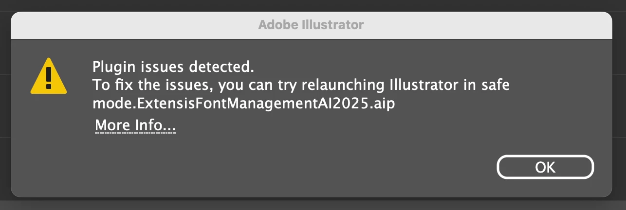 Mac Sequoia 15.3. I upgraded to a new iMac and needed to resinstall all my Adobe apps. The only one that's still not right is Illustrator. When I launch AI, I get two error messages. Please see the attached. I tried getting more info, but that only links to info on AI crashing. This may be an Extensis Connect Fonts issue. I tried deleting the .aip file, then opening Connect Fonts to reinstall it, then relaunching AI but I still get those errors. AI and Connect Fonts are both running their current version. Also, if I'm opening an AI file from Bridge or the Finder, I get those two errors but the file doesn't open. I need to go back and re-open the file from Bridge or the Finder. Any help greatly appreciated.