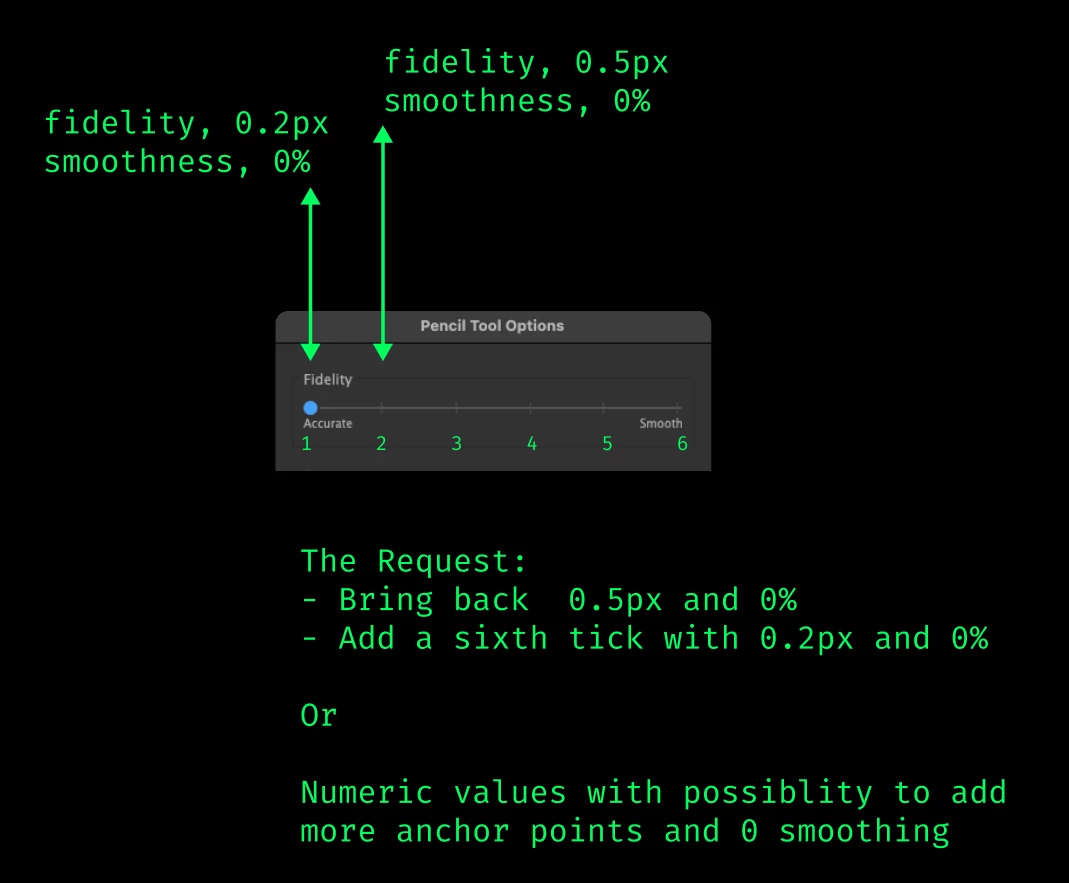 Back in 2014, when Adobe rewrote the Pencil tool, you removed the previous numeric settings and replaced them with four ticks. All of them were too smooth and took too much control over the path, leading to imprecise bubbly and smooth drawings.
