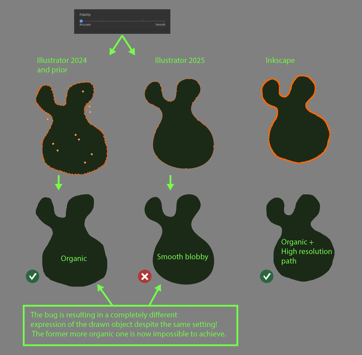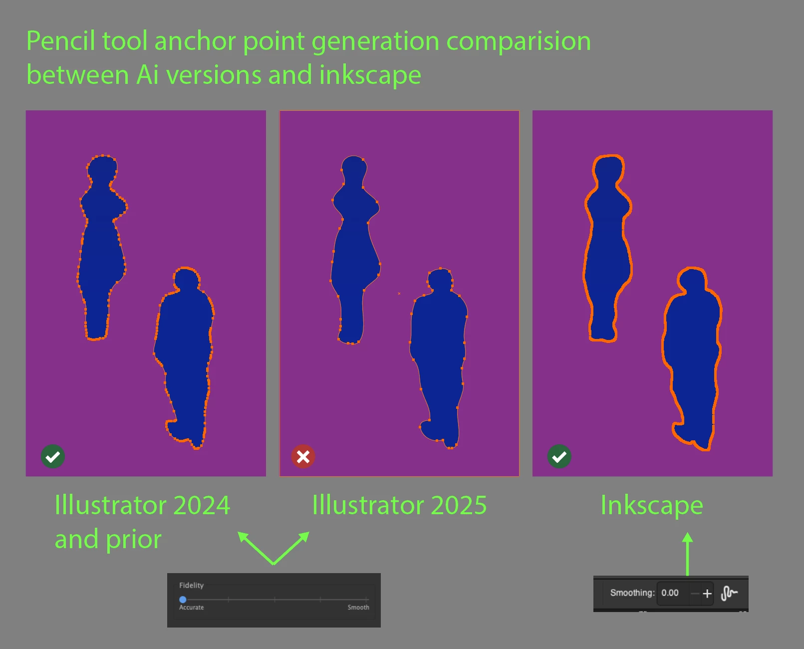 Now, after the 2025 update, the pencil tool once again is smoothing too much, even on the lowest accuracy setting. This is making mine and my colleagues work impossible because the tool doesn’t generate enough anchor points to create the detailed and organic edge illustrations we need. Not everyone is looking to draw smooth, bubbly shapes!