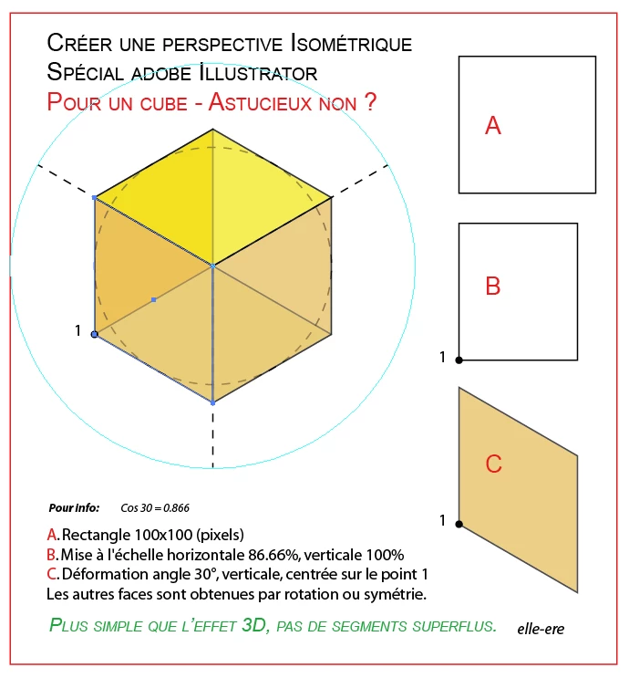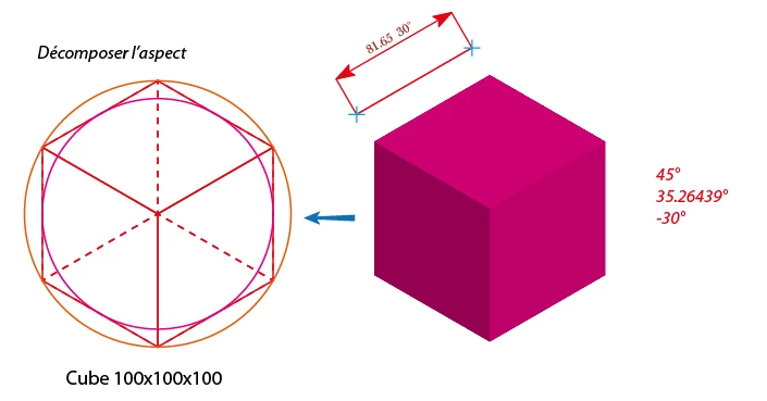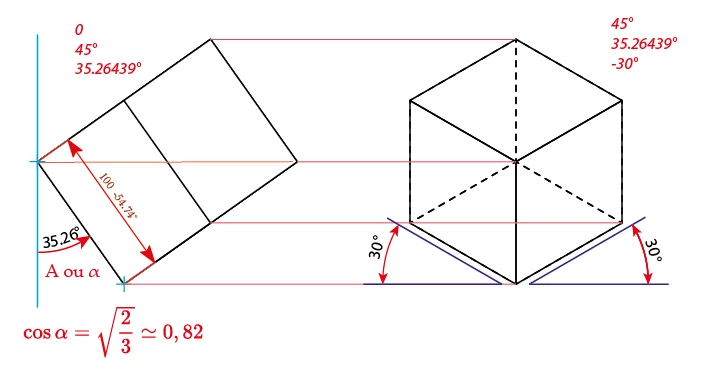 Pour moi, il suffit à partir de l'objet de face, de le faire pivoter de 45° autour de l'axe central vertical puis de le faire basculer vers l'avant de 35,26°. (voir vue de gauche ci dessous)