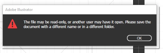 When I try to save a file this dialog window keeps popping up, it says "The file may be read-only, or another user may have it open. Please save the document with a different name or in a different folder." I'm using windows 10 with the latest version of Illustrator CC