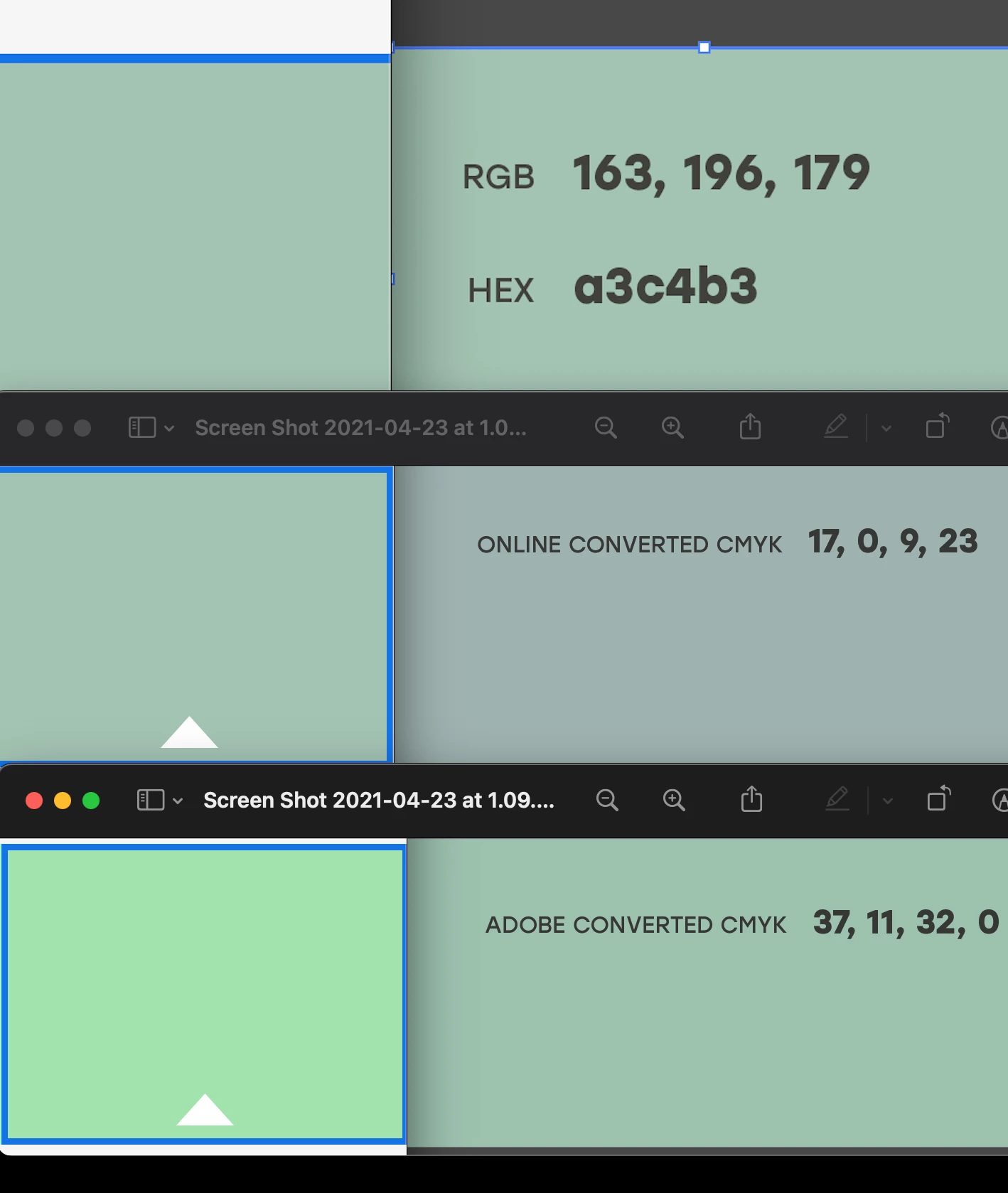 And in the middle row, we're looking at the Adobe Color CMYK conversion of the RGB values. It looks good on that website but then when I bring them into Illustrator, the muddier/bluer looking color is created.