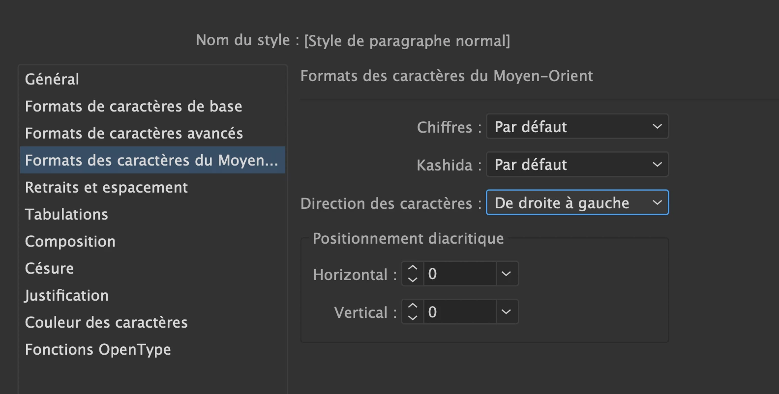 Ensuite tu règles les options caractères du moyen orient > droite à gauche dans le style de paragraphe voulu. Comme ça tu peux combiner des paras en européen et moyent orient
