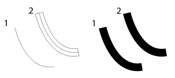 So my question is, please see below, just like creating a stroke (1), giving it a certain thickness, and then doing an "outline stroke" to get #2, I'm looking for just THE OPPOSITE, take a path (my traced logo), like #2, AND TURN IT INTO A SINGLE STROKE. Then I will give all the letters the appropriate thickness — and then outline them. That way all the letters in the logo will be at a consistent thickness, as a logo is expected to be.
