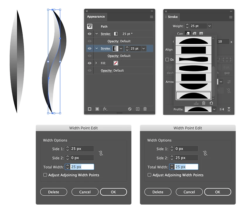 To do this, I used the curvature tool to make a curved line, used the width tool to expand it to get the shape I wanted, then converted it to an object. Next, I used the curvature tool again to split the object in half, used the pathfinder to make an outline, then cleaned up each object. I applied gradients to each object, which essensially gave me the look I wanted.