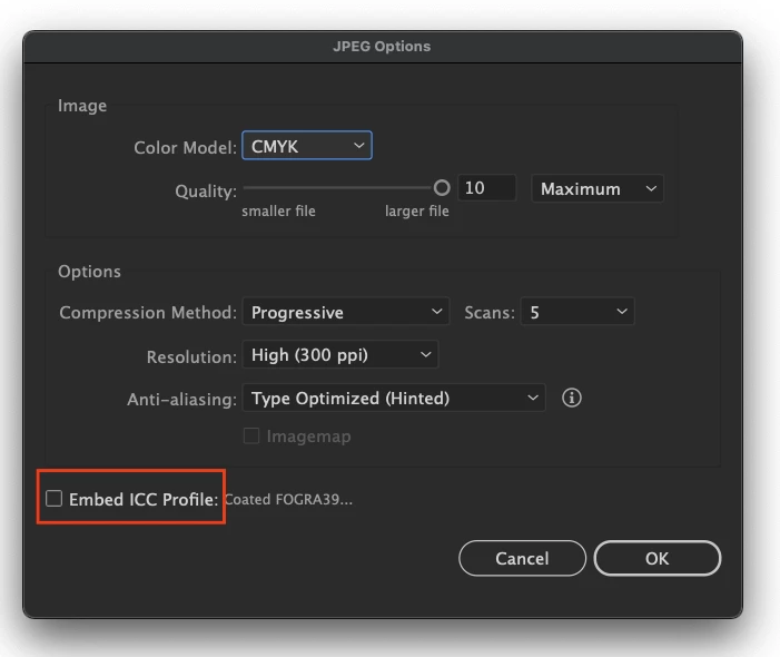 - If you want to export the images in the CMYK profile only, then uncheck the Embed ICC Profile option.