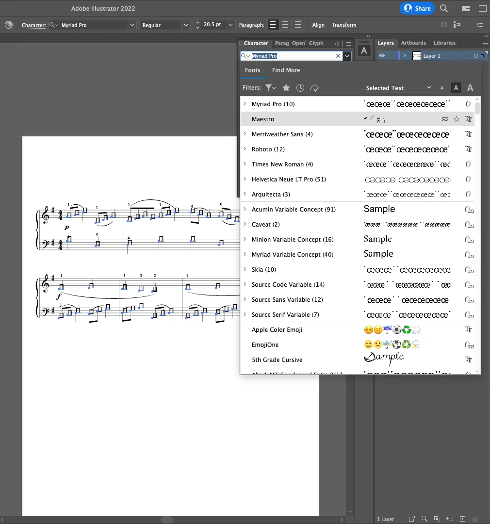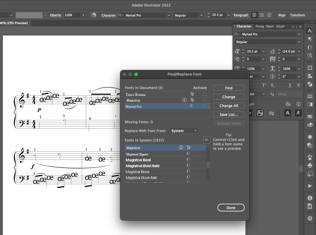 I have an issue with replacing missing font. Missing font is replaced with default Myriad Pro but I need to replace it with Maestro Glyph. I use Find/Replace Font for it but it does not work and is not replacing the font. The olny way is to manually copy paste the Glyph to raplace it in Illustrator. Is there somehind of easyer way to replace miltiple characters with glyph?