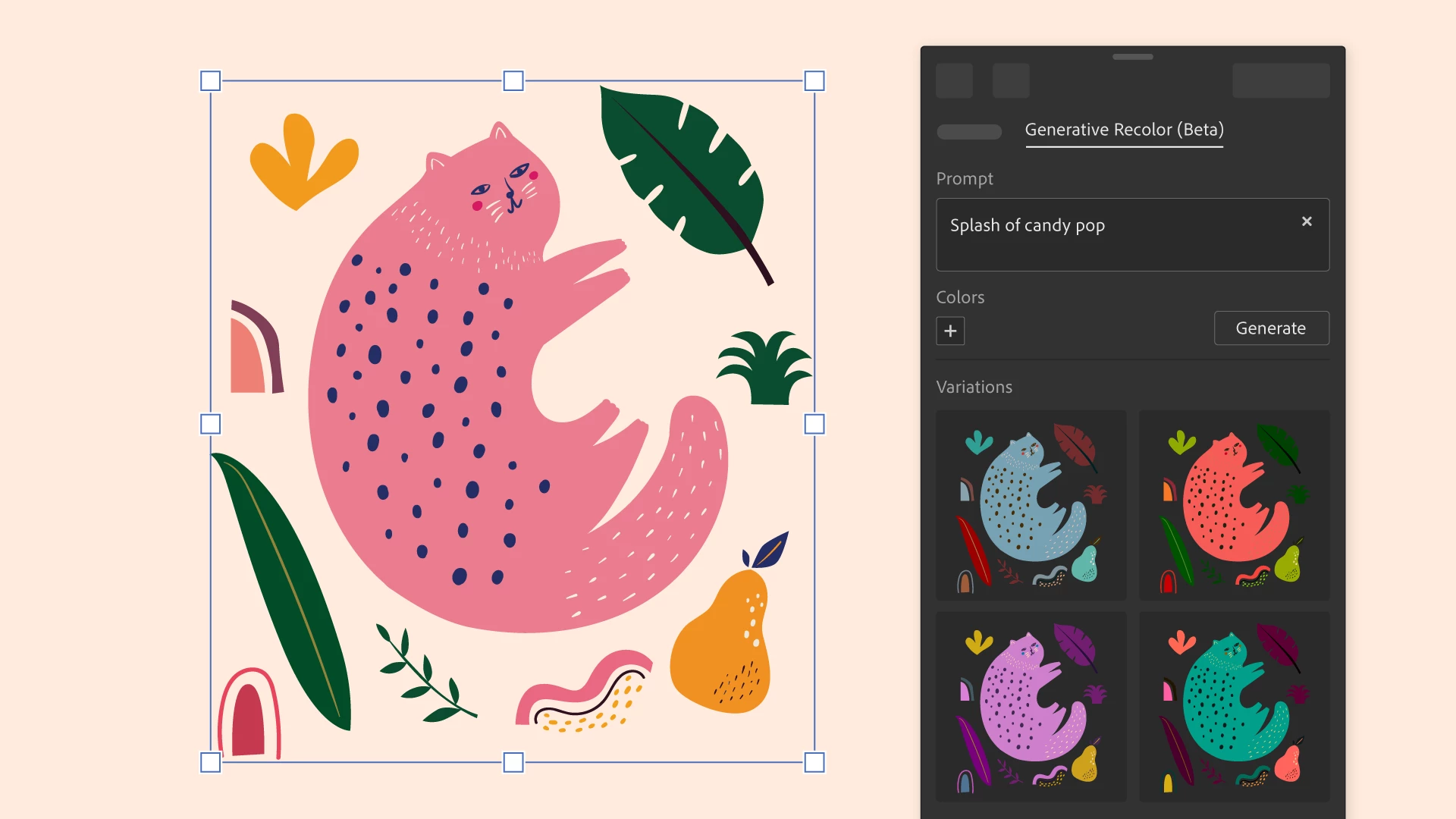 Simply describe your desired color theme or palette using plain text, and watch as Illustrator generates multiple variations within seconds. Preview the options in real-time and choose the perfect fit for your artwork.