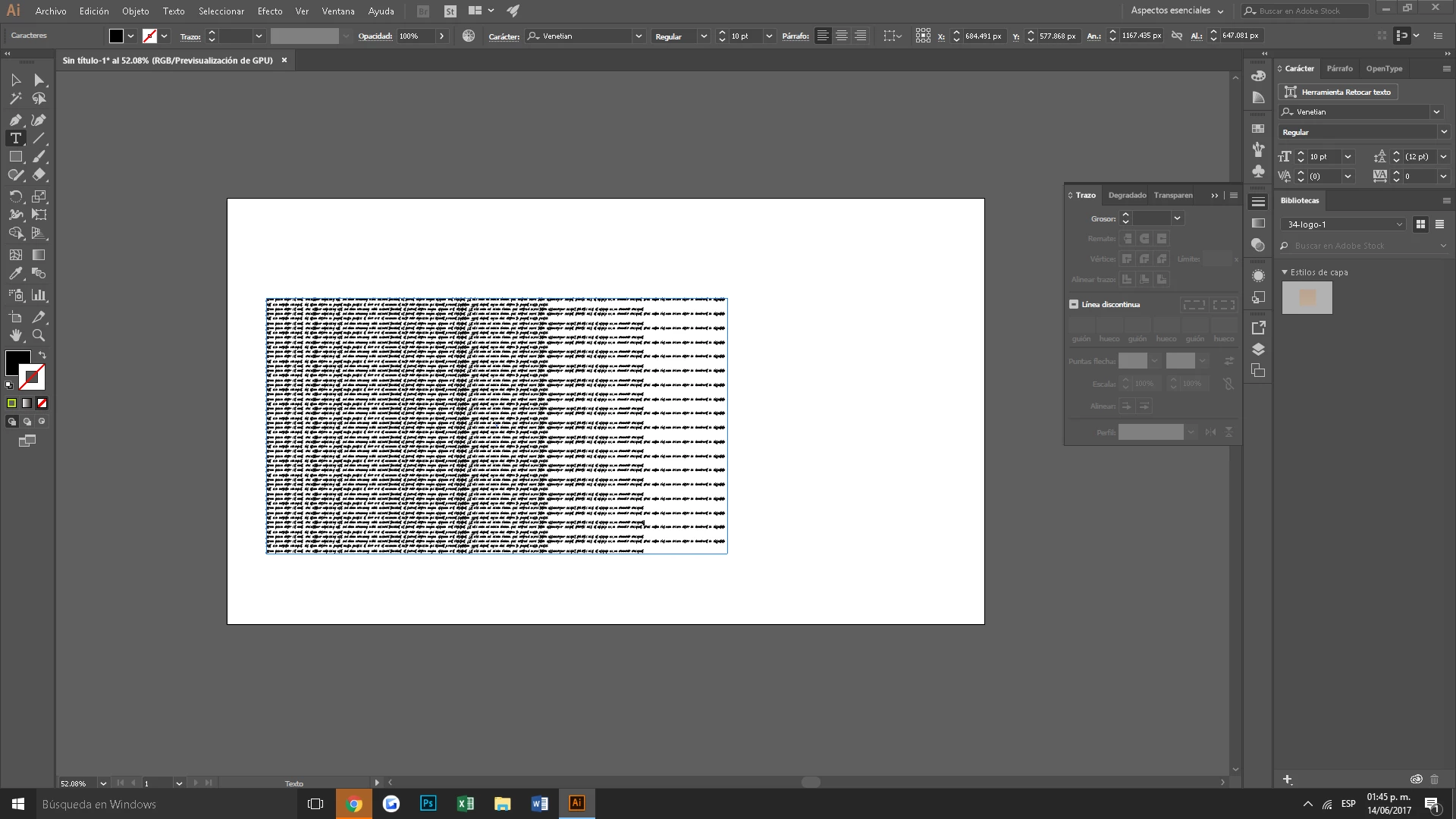 Hola necesito ayuda con illustrator , (1) Cuando abro para escribir un texto se ve asi , Solucion para que no se vea mas? (2 foto) quiero ponerle un trazo al texto y cuando le doy a exterior no se hace nada se queda en trazo interior ! HELP