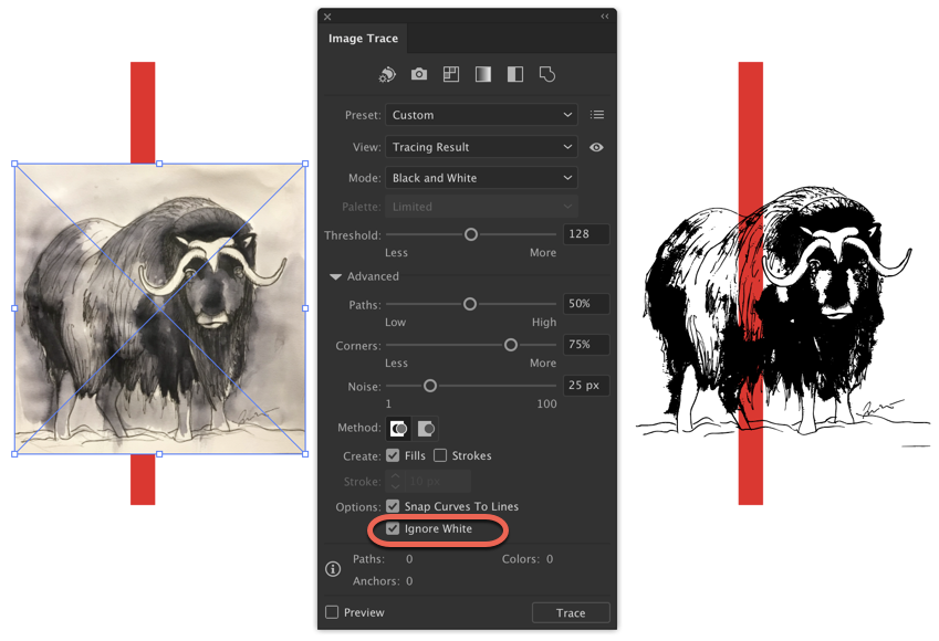 Image trace, editing with Threshold until happy, not checking "Ignore White"