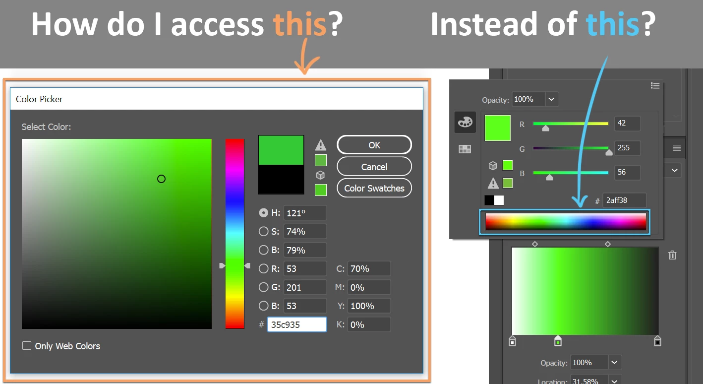 Now, double clicking the Fill icon from the Tools panel brings up the full glorious Color Picker that is reminiscent of the one in Photoshop. So I know that full window exists within Illustrator but I can't figure out how to expand that small color spectrum into the larger one. How do I gain access to that full color picker window when I'm selecting colors within the Gradient Panel? Thanks for any advice you can provide!