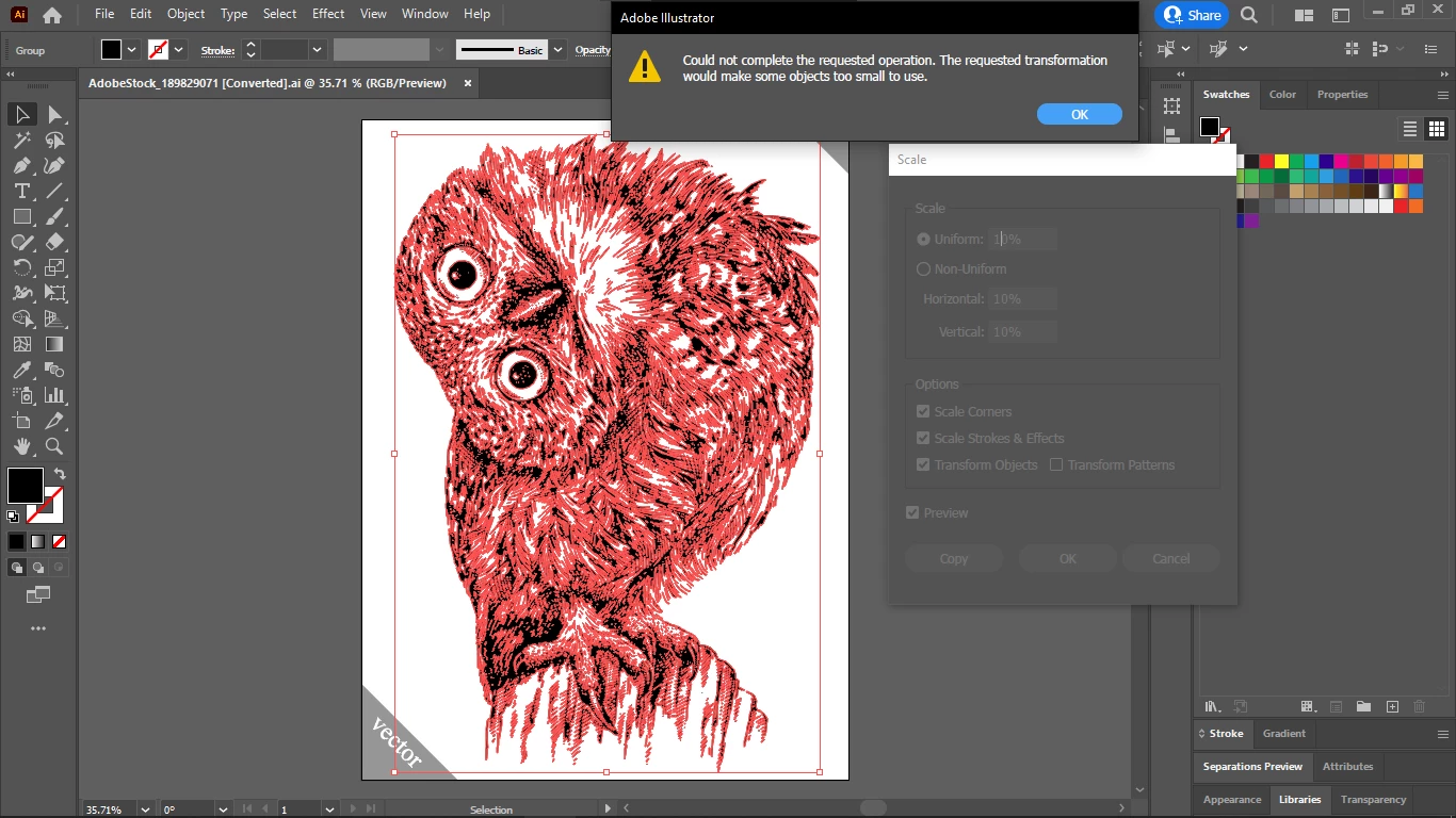 But I cannot use it as vector, since I need the white background exactly behind the owl (not further), and even after max simplification it wouldn't let me to scale it down to 10%. I get the