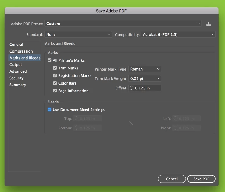 Instinct tells me i need to put minus figures in the Bleed Settings but that isn't an option.