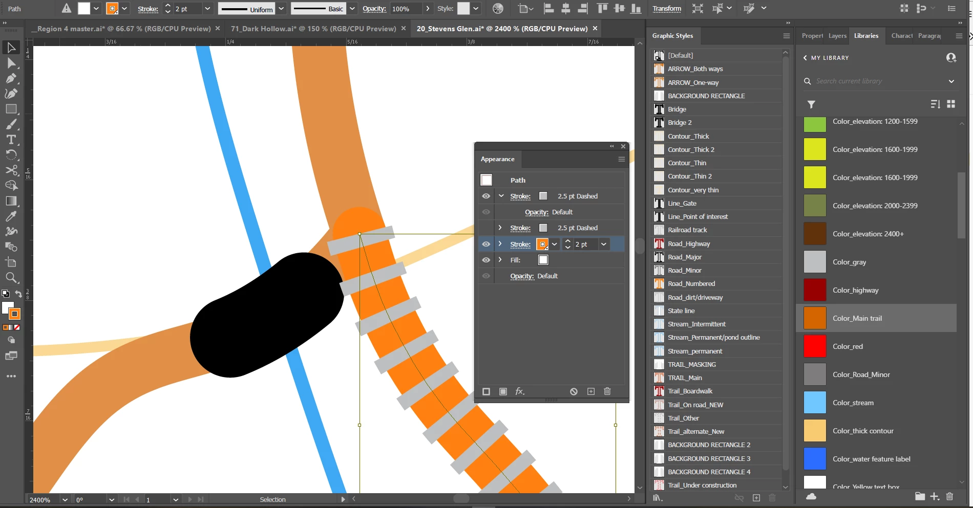 I am newish to Illustrator and am going crazy about something that seems like it should be simple: I'm trying to make two adjacent paths the same color. I've checked seven different links that mention the eyedropper tool, but after trying all of them, nothing has worked. Below is a screenshot of what I'm trying to do. See how one path (the one with the gray stripes) is a different shade of orange from the one above it? I want them to be the same color of orange. In my library (on the right), I have a color called "Color_Main trail." When I pull up the Appearance panel of the path I want to change (with the gray stripes), I click on Stroke and then go to the library and Alt-click on the color, which usually works ... but nothing happens. When I tried to use the eyedropper tool, even after clicking, Alt-ing, Shifting, etc., nothing happens. I checked the layers, and nothing is locked. Could someone let me know what's going on? I've so far spent 45 minutes trying to change a color and googling things. Thanks in advance!