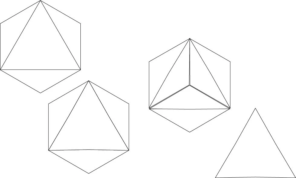 I used the triange tool to create the first inner triangle. But then I had trouble lining up the corners. And when I used the path menu to divide the polygon below, I discovered I had overextended my corners. I was expecting to have to use the scissor tool to cut the joined corners of the smaller triangles, so I could reflect them to create the inner three trianges - which are meant to be all joined together neatly, no spaces, and perfectly aligned. Instead, because of the overshoot I had my distinct triangles, but when I reflected them, they were all out of whack. I tried to fix them by aligning the corners vertically and horizontally, but now I have spaces. I'm trying to fit these all neatly and perfectly within the shapes.