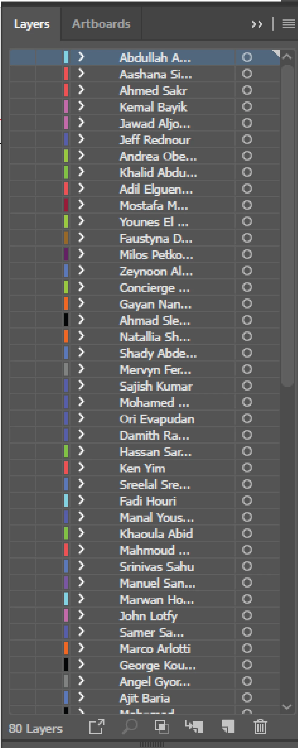 I am creating number of visiting cards for Hotels & Companies. So I choose this way, each person in one layer now almost 80 visiting cards I made in one Ai File. I work in printing press. So regularly Clients ask me to reprint some of these v-cards. Now I searching manually one by one.