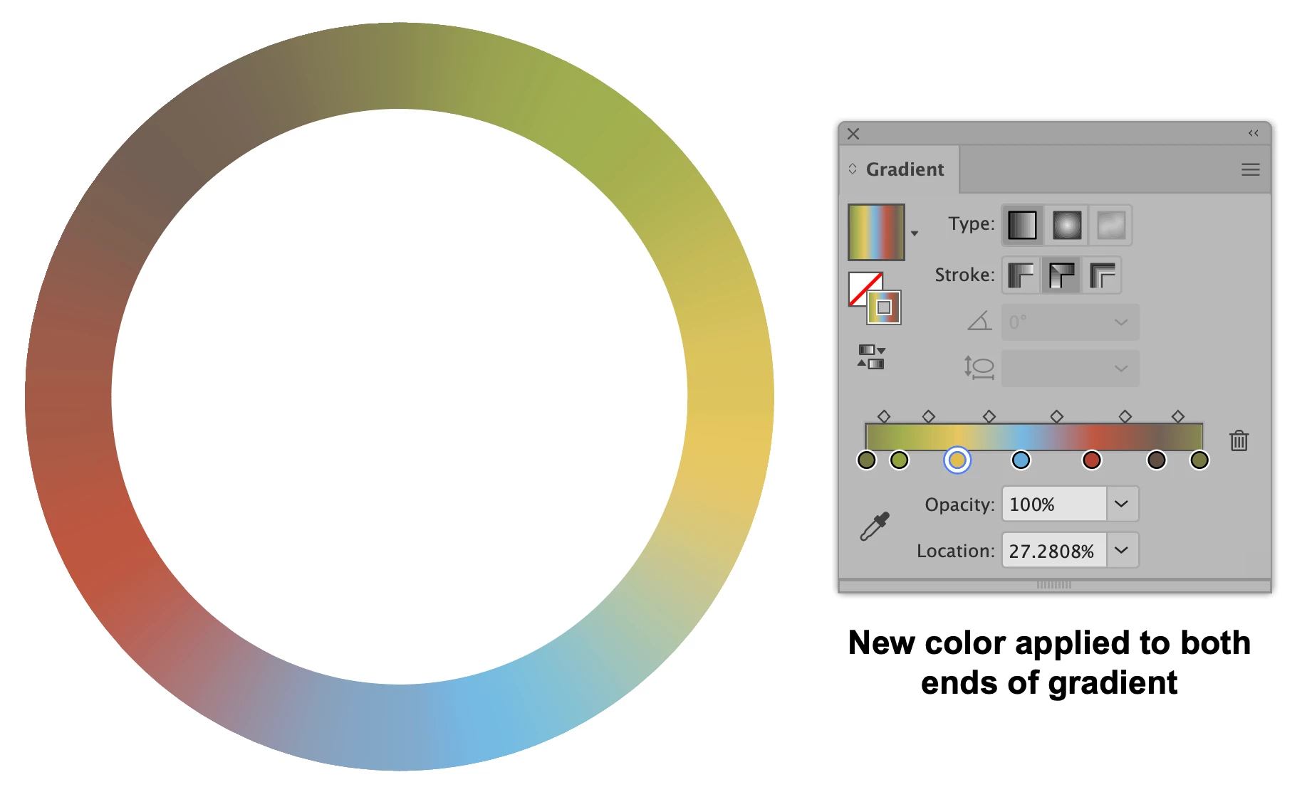 7. Go to the circle with the multi-colored gradient and add stops at both extreme ends of the gradient, applying the new color to each.
